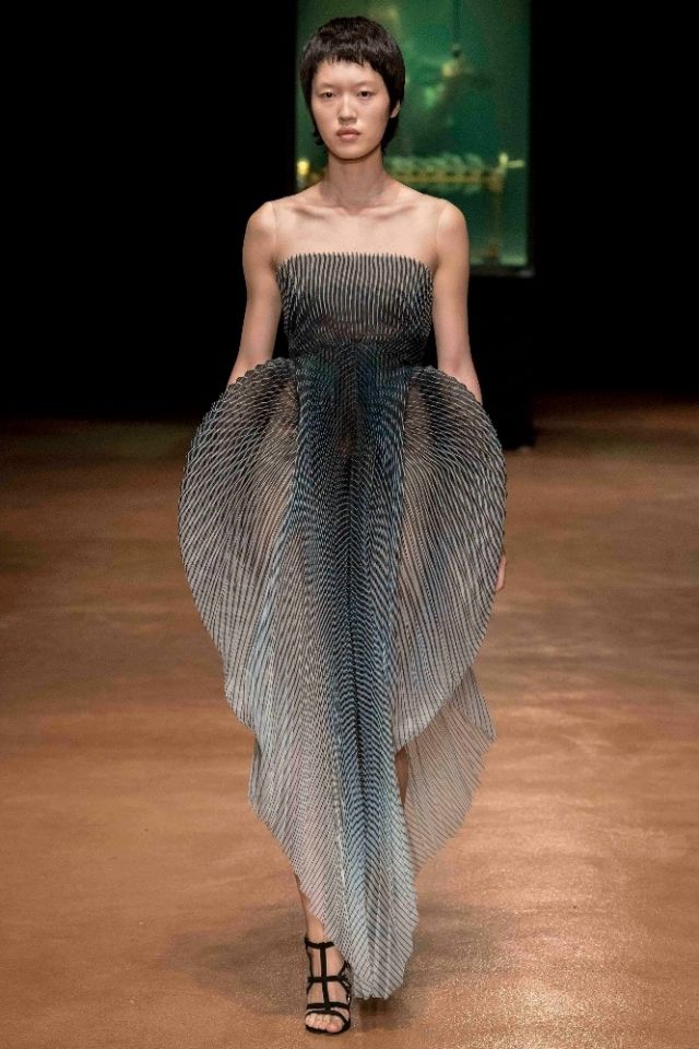 ظهرت الفساتين المستوحاة من الغيوم مصنوعة من الريش الخفيف والدانتيل المعدنيّ والورود المستقبلية بتقنية ثلاثية الأبعاد.