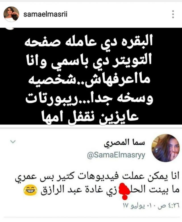 وقالت سما أن هناك من تنتحل شخصيتها ودشنت حسابا مزيفا على تويتر باسمها، وتنشر تعليقات مسيئة تنسب إليها.