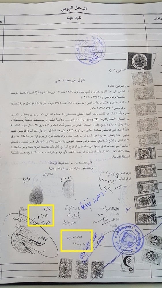 ٢- تجدون مع البيان صور تنازلات علي حسون عن اغنية "ضلي ضحكي" والتي توضح تاريخ التنازل حيث سحب في يوم أمس في العاشر من الشهر الحالي صورة طبق الأصل عن التنازل، وسوف تقوم شركة "بلاتينوم ريكوردز" المنتجة لألبوم ملحم زين "الجرح اللي بعده" بإرسال اوراق التنازل.