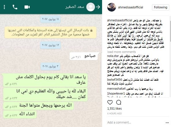 وعلق أحمد سعد على تلك المحادثة قائلاً "ي ا جماعة .. مش أي حد يتاجر بظروفه ويطلع يشهر بيا يبقا صادق .. العزاء مش للمظاهر الكدابه العزاء لوجه الله فقط .. وانا بتقي الله في علاقاتي بالناس لوجه الله مش عشان اظهر قدام الناس بشكل معين".