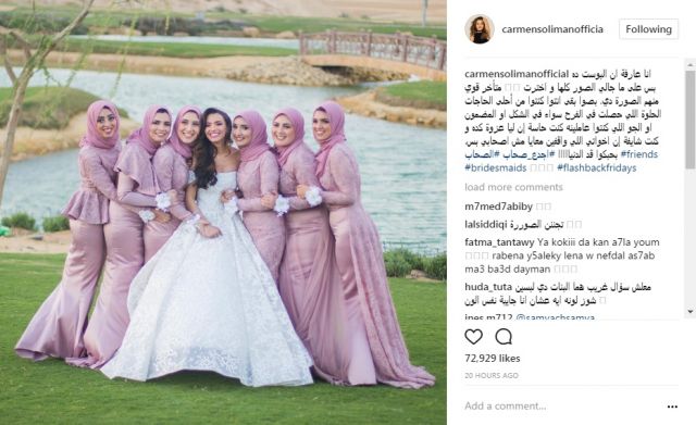 نشرت الفنانة المصرية كارمن سليمان، عبر حسابها الرسمي على تطبيق "انستغرام"، صورة لها من حفل زفافها، الى جانب إشبيناتها.
