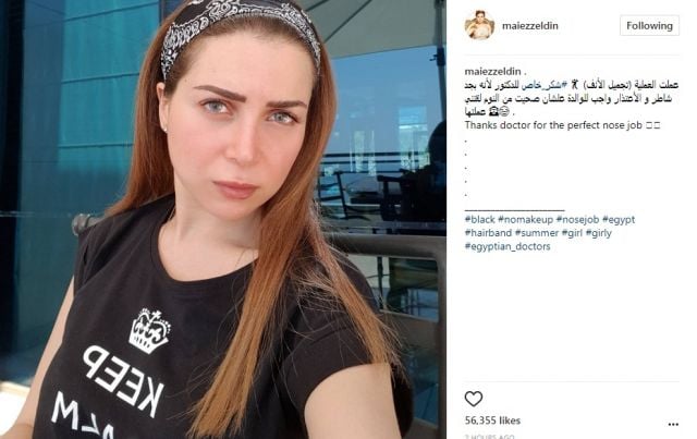 وأردفت الصورة بتعليق جاء فيه: "عملت العملية (تجميل الأنف) شكر خاص للدكتور لأنه بجد شاطر، والاعتذار واجب للوالدة علشان صحيت من النوم لقتني عملتها".