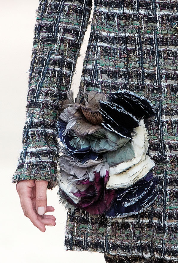 في المجموعة الخريفية، بدت جاكيت التويد الشهيرة على شكل سترة طويلة أو قصيرة بصفّين من الأزرار. الكمّان فضفاضان واسعان محدّدان بقفّازات طويلة فارغة الأصابع، ويتوزّع الريش هنا وهناك. «الريش في هذه المجموعة مُستخدم مثل الفرو تماماً، أضفناه إلى التنانير الملتفّة والفساتين الفضفاضة وبذلات الجامبسوت الواسعة»، يقول لاغرفيلد. الطلّة هندسيّة جداً ومعزّزة بالتويد والموهير والصوف الأسود والأبيض والرمادي، إضافة الى لوحة ألوان خريفية تتراوح بين الكحلي والبرغندي والأخضر، في وقت يترك كارل للأسود مساحات واسعة يتألّق فيها في السهرات وحده، أو مع الأبيض... فساتين من الشيفون الكحلي وتول الحرير الأسود والساتان الثنائي الوجه، تبطّنت بالمعادن اللامعة وتزيّنت بالنقوش الملوّنة والتطريزات المتلألئة التي تشبه أنوار برج إيفل ذات ليلة شتوية باردة. ويتوزّع الترتر والبرق على الفساتين والقبّعات والتويد والساتين اللامع، ليضيف ألقاً إلى الإطلالات الباريسية المتجدّدة والفاخرة. وأخيراً، توّج العرض بدخول العروس وهي ترتدي فستاناً مهيباً من الساتين الأبيض المزيّن بكميات هائلة من الريش على شكل باقات لا متناهية من الكاميليا الرائعة.