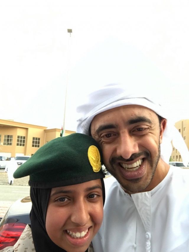 نشر وزير الخارجية الإماراتي الشيخ عبدالله بن زايد آل نهيان عبر حسابه على "تويتر" صورة له برفقة ابنته فاطمة التقطت خلال تخرجها من إحدى الدفعات العسكرية في القوات المسلحة في الإمارات.