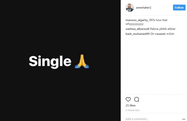 ونشر طاهر عبر حسابه الشخصي على تطبيق "إنستقرام" صورة مكتوب عليها باللغة الانكليزية "عازب"، كما حذف صوره مع خطيبته السابقة من حسابه من دون أن يوضح أسباب انفصالهما.