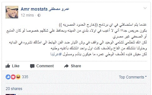 وكتب مصطفى عبر صفحته الشخصية على موقع التواصل الاجتماعي "فيسبوك": "عندما يتم استضافتي في أي برنامج خارج الحدود المصرية بكون حريص جدًا أني لا أعيب في أولاد بلدي من المهنة وبحافظ على شكلهم خصوصا لو كان المذيع أو الصحفي غير مصري".