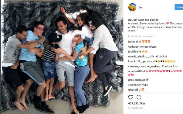 وعلقت النجمة العالمية على صورة ائلة بحب: "فقط ما أمره الطبيب .. محاطاً بالحب"، وعلقت على موت أمه باللغة الاسبانية "ارتاحي في سلام جيني ... سنفتقدك".