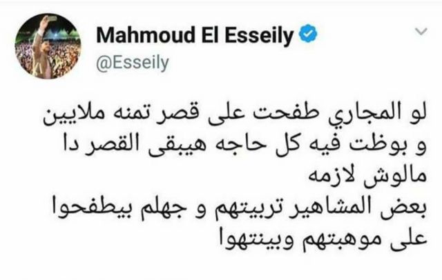 وكتب العسيلي: "لو المجاري طفحت على قصر تمنه ملايين وبوظت فيه كل حاجة هيبقى القصر ده ملوش لازمة.. بعض المشاهير تربيتهم وجهلهم بيطفحوا على موهبتهم وبينتهوا".