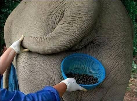 بدايةً، تبدأ عملية الإنتاج عبر إطعام الفيلة خليط مؤلّف من حبوب البن مع قطع الكرز، ثمّ إنتظار 3 أيام، حتّى خروج الحبوب من روث الفيلة، بعد مرورها بالجهاز الهضمي.