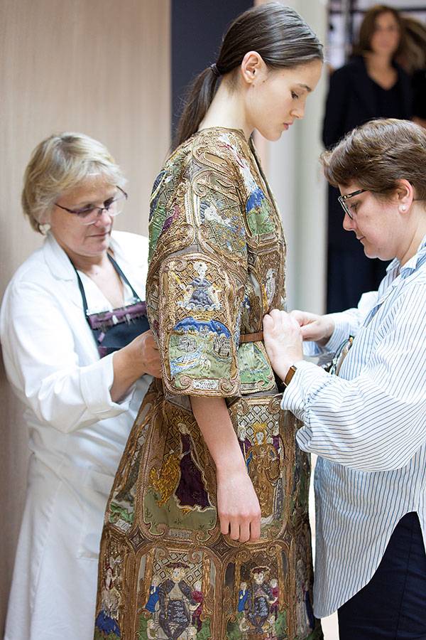 مجموعة رائعة مستوحاة من أرشيف دار ديور تحتفي بالذكرى السبعين لتأسيسه. على غرار المستكشِفات الأوائل اللواتي تجاوزن الحدود الجغرافية والنفسية، تلعب ماريا غراتسيا كيوري دور البطلة وتستعير العناصر من أزياء الرجال وتمزجها مع الثياب العرقية. بفضل الطابع الحسّي للمصمّمة والتكنولوجيا الجديدة، يتمّ تحويل أقمشة ثياب الرجال إلى أسطح برّاقة مع اعتماد تقنية الجلاء والقَتَمة «كياروسكورو» في السترات، المعاطف، البلوزات، والرداءات السروالية «جمبسوت» التي تعيد الى الأذهان السترات بأسلوب الطيارين والسراويل المكسّرة على شكل تنورة. وأصبح هذا المسار في رحلة العودة إلى الوطن بمثابة طوبوغرافيا من المشاعر بالنسبة إلى ماريا غراتسيا كيوري: الألوان والأزهار وأوراق التارو المطرّزة تصبح بحدّ ذاتها بمثابة أطلس على تصاميم الكاب وفساتين السهرة المصنوعة من الحرير والتول، باللونين الرمادي والزهري أو الدرجات الداكنة من المخمل. هذا العالم الخيالي، الذي يرتكز على فن رسم الخرائط النابع من نسج الخيال الذي يبتكر وجهات النظر ويتحدّاها، يعيد إلى الأذهان الخرائط التذكارية والمجسمات الهائلةالتي تجسّد الرحلات الأدبية الأنثوية المفعمة بالقوة، واستكشاف الثقافات والأسلوب.