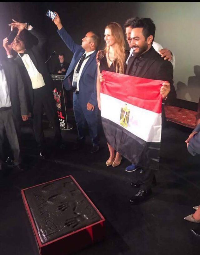 ووضع تامر يديه وقدميه في الكتلة الأسمنتية بالساحة الرئيسية للمسرح، مثلما حدث مع نجوم العالم أمثال براد بيت، ومايكل جاكسون.