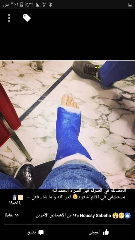 ونشرت ياسمين صورة عبر حسابها على فايسبوك، وقد وضعت قدمها في الجبس، وعلقت ياسمين: "الحمد لله في الضراء قبل السراء الحمد لله قدر الله وما شاء فعل".