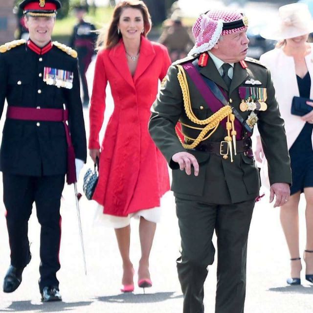 وأطلت الملكة رانيا بفستان احمر طويل مزركش في حفل تخريج فوج من ضباط الأكاديمية العسكرية الملكية "ساندهيرست"، والذي ضم نجلها.
