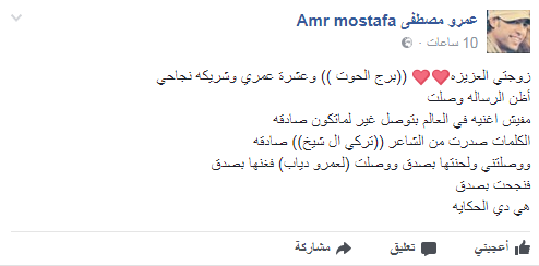 وكتب الملحن الذي عاد بعد خلاف طويل مع "الهضبة" عبر صفحته على "فايسبوك" قائلًا: "زوجتي العزيزة برج الحوت وعشرة عمري وشريكة نجاحي، أظن الرسالة وصلت مفيش أغنية في العالم بتوصل غير لما تكون صادقة".
