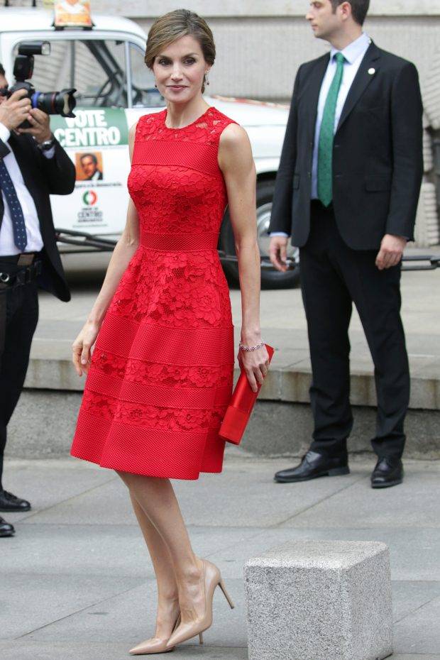 أسلوب ملكي وأنثوي اختارته الملكة ليتيزيا بفستان أحمر بالقصة على شكل "A"، مما أضاف رومانسية إلى ملامحها الجذابة. أما الدوقة كايت ميدلتون، فاحتفظت بكلاسيكية حضورها بالقصات البسيطة بجرأة هذا اللون المميز.