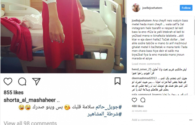ونشرت جويل التّعليق قائلةً: "أنا شايفة ناس واطيين بس متل هيدا مني شايفة، ولا صفحة على "انستغرام" هيك تصرّفت ومع احترامي للكلّ بس لأنو رفيقها ليلّلي بتكره الكلّ بيقبض منها وبينفّذلها طلباتها".