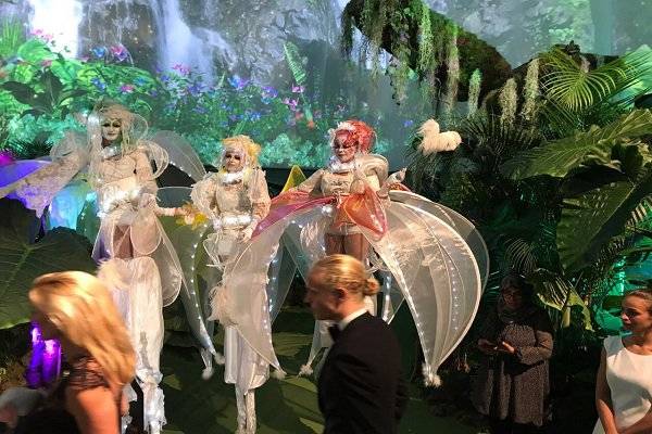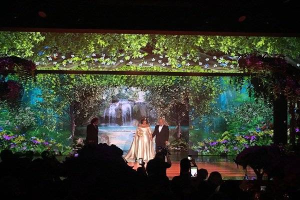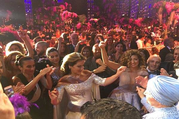 وأطلت العروس على المسرح بفستان من تصميم مصمم الأزياء الفرنسي ستيفان رولاند، وباقة زهور من الذهب والألماس، حيث كان في انتظارها والدها، رئيس مجلس ادارة قناة "الجديد" تحسين خياط. وقدم لها الملحن سمير صفير أغنيته الجديدة التي أطلقها في هذه المناسبة.