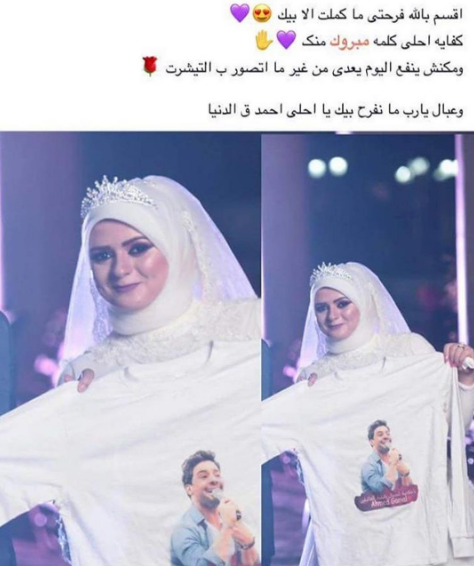 وحرصت العروس على التعبير عن فرحتها، وحملت تيشيرت مطبوع عليه صورة أحمد جمال في ليلة زفافها، وعلقت قائلة "أقسم بالله فرحتي ما كملت إلا بيك.. كفاية أحلى مبروك منك.. ومكنش ينفع اليوم يعدي من غير ما اتصور بالتيشيرت.. وعقبال يا رب ما نفرح بيك يا أحلى أحمد قد الدنيا".