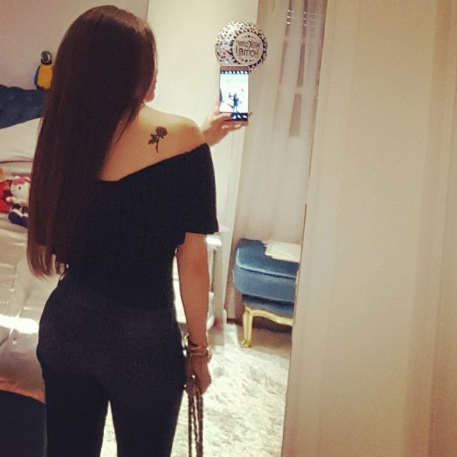 وظهرت النجمة فيها وهي تلتقط لنفسها صورة على طريقة السيلفي وقد نقشت على كتفها تاتو على شكل وردة.