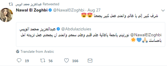 وغرّد، عبر حسابه الرسمي على "تويتر": "نورتيني يا نجمة يا غالية على قلبي وعلى سمعي واتمنى ان يجمعني عمل تزيدنه امل باحساسك".