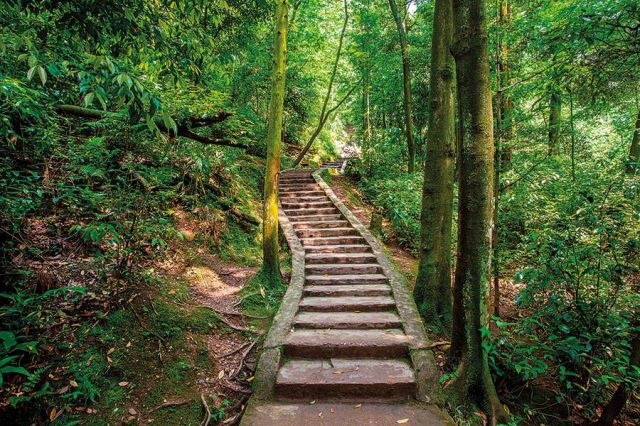تسلّقنا جبل كينغتشنغ رويداً رويداً، لأن الأدراج شاهقة ودرجات الحرارة عالية ومستوى الرطوبة مرتفع جداً. توجب علينا الاستراحة بين الحين والآخر لالتقاط أنفاسنا وشرب الماء.