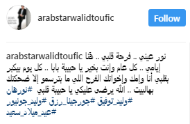 وجاء في رسالته: "نور عيني.. فرحة قلبي.. هٙنا إيامي.. كل عام وإنت بخير يا حبيبة بابا.. كل يوم بيكبر بقلبي أنا وإمك وإخواتك الفرح اللي ما بترسمو إلا ضحكتك بهالبيت .. الله يرضى عليكي يا حبيبة قلبي".