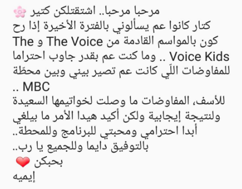 ونشرت إيميه، عبر حسابها الرسمي على "تويتر"، صورة، كتبت عليها ما يلي: "مرحبا مرحبا.. اشتقتلكن كثير. كتار كانوا عم يسألوني بالفترة الأخيرة إذا رح كون بالمواسم القادمة من The Voice وThe Voice Kids.. وما كنت عم بقدر جاوب احتراماً للمفاوضات اللي كانت عم تصير بيني وبين محطة MBC..".