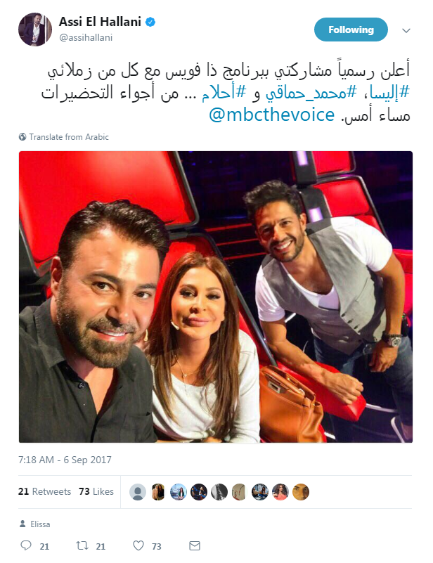 ونشر الحلاني، عبر حسابه الرسمي على "تويتر" صورة جمعته بكلّ من إليسا وحماقي، وغرّد: "أعلن رسمياً مشاركتي ببرنامج ذا فويس مع كل من زملائي إليسا، محمد حماقي وأحلام... من أجواء التحضيرات مساء أمس".