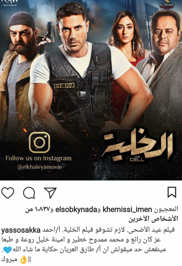 نشر ياسين، نجل الفنان أحمد السقا، عبر حسابه الشخصي على "إنستغرام" صورة أفيش فيلم "الخلية" للفنان أحمد عز، داعيا اصدقائه ومتابعيه، لمشاهدة الفيلم لروعة قصته.