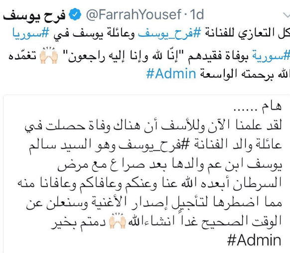ونشر أحد مدراء حسابي نجمة "آراب آيدول" على موقعي "تويتر" و"انستغرام": "هام .. لقد علمنا الآن وللأسف أن هناك حالة وفاة حصلت في عائلة والد الفنانة فرح يوسف وهو السيد سالم يوسف إبن عم والدها بعد صراع مع مرض السرطان أبعده الله عنا وعنكم وعفاكم وعافانا منه، مما إضطرها لتأجيل إصدار الأغنية وسنعلن عن الوقت الصحيح غداً أن شاء الله . دمتم بخير".