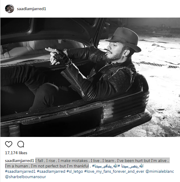 قال النجم سعد لمجرد: "أنا أقع، وأنهض، وأرتكب الأخطاء، وأعيش، وأتعلم، لقد جرحت ولكن أنا حي. انا انسان، لست كاملاً، ولكني شكوراً".