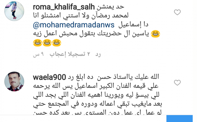 نشر الفنان حسن الرداد عبر حسابه الشخصي على إنستغرام فيديو قصير لمقابلة مسجلة للفنان الراحل نور الشريف، يكشف فيها عن موقف طريف حدث للرئيس المصري الراحل جمال عبد الناصر، ويرتبط بالفنان الكوميدي اسماعيل ياسين. وظهر في الفيديو، نور الشريف وهو يقول أن الرئيس جمال عبد الناصر كان في زيارة لملك المغرب محمد الخامس، وبعد خروجه بسيارته فوجئ بمواطن مغربي يقترب، ويطلب منه أن يرسل التحية للفنان إسماعيل ياسين. وعلق حسن الرداد على ذلك الفيديو قائلاً: "إسماعيل ياسين"، ما جعل بعض من متابعيه يظن إنه يقصد الرد على هجوم محمد رمضان على الفنان الكوميدي الراحل ويوجه له درساً في الكلام عن النجوم الكبار الراحلين. وكان محمد رمضان قد قال في حديث صحفي أنه ضد أفلام إسماعيل ياسين التي جسد فيها دور المجند المصري، لأنها تقلل من هيبة الجندي والجيش، ثم أوضح "رمضان" بعد ذلك أنه يحب ويقدر إسماعيل ياسين، موجها إعتذارا لأسرة الفنان الراحل.