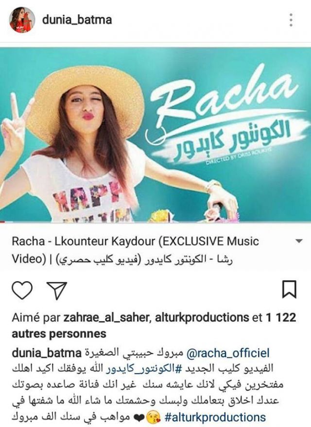 فيما ردت عليها رشا في حسابها على الفايسبوك: "شكرا دنيا النجمة الراقية -بنت بلادي - التي تحرص على دعم المواهب الصاعدة. دمت دائماً فخراً لكل المغربيات".