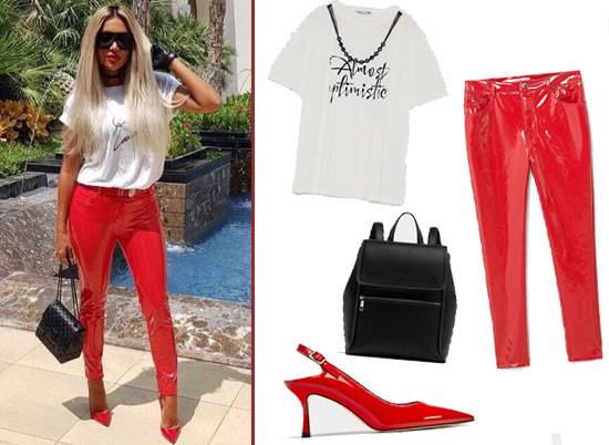 تألفت هذه الإطلالة من سروال لاتيكس لماع باللون الأحمر، نسقناه لك مع تيشيرت بسيطة باللون الأبيض إسوةً بمايا.