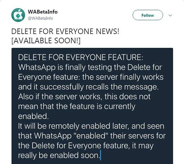 فقد نقلت صحيفة "ديلي ميل" البريطانية عن حساب "WABetaInfo" على "تويتر"، أنّ "واتساب" سيطرح خاصية "إلغاء الرسالة" (نص، فيديو، صورة...)، قريباً جداً.