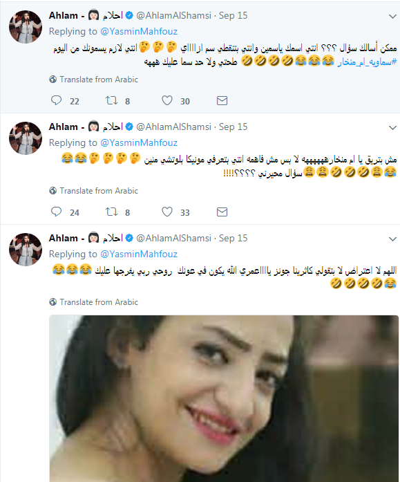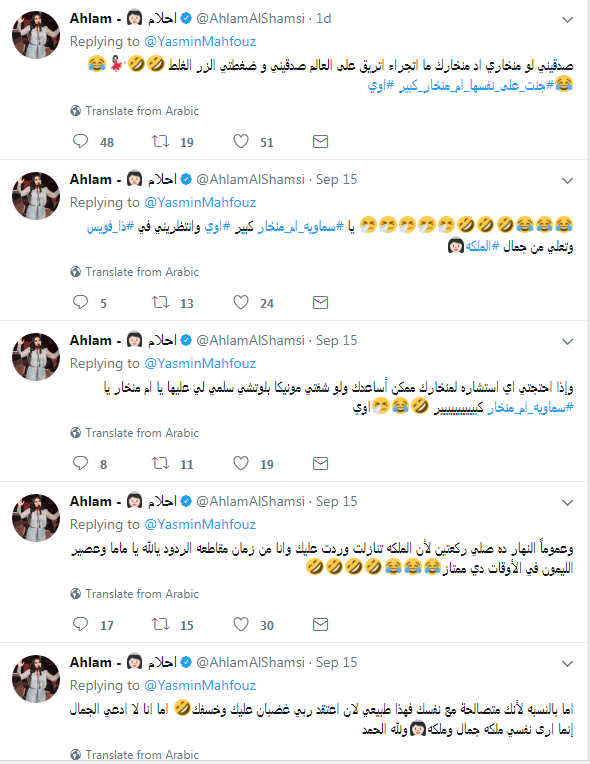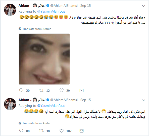 ردت النجمة الإماراتية أحلام بشكل صاعق وقوي على متابعة حاولت الاستهزاء منها عبر موقع "تويتر"، فردت لها الصاع صاعين ولكن بطرافتها المعهودة.