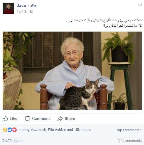 وكتبت "جاكو" أو "منسّق الصفحة": "عملت مهمتي... زرعت الفرح بقلوبكن وفليّت من هالدني... كل ما تبتسموا تبقوا تذكّروني!!".