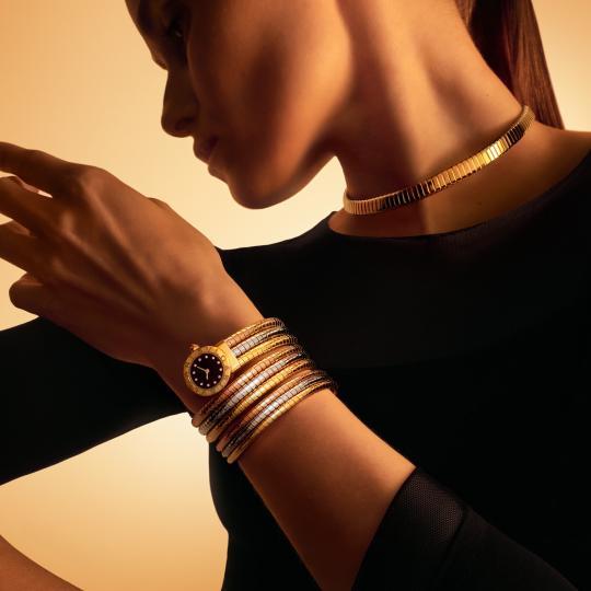 في ذات المناسبة، تُبرز ساعة بولغري توبوغاس الجديدة مكانة بولغري كشركة رائدة في صناعة ساعات المجوهرات. تجمع الساعة بين بصمتين أسلوبيتين مميزتين للدار، إذ تتميز الساعة بمرونة سوار توبوغاس الأنبوبي ونقش الشعار المزدوج على علبة الساعة المصنوعة من الذهب الأصفر، المستوحى من النقوش الدائرية على النقود الرومانية القديمة. تأكيداً على التزام بولغري بالمعدن النفيس، صُنِع السوار المرن والمريح من الذهب الأصفر والأبيض والوردي، مما يخلق تبايناً أنيقاً مع ميناء الساعة المطلي باللكر الأسود ومؤشرات الساعة المصنوعة من الألماس.